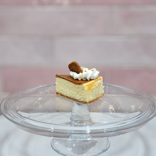 Romige cheesecake met een kruimelige koekjes bodem. Afgewerkt met lotus biscoff pasta