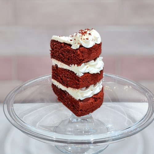 Een heerlijke cake met een rode kleur, subtiele cacao tonen en een romige laag cream frosting